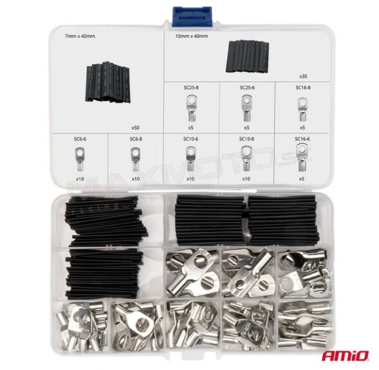 Sada AMIO obsahuje 80 zmršťovacích bužírok a 60 očkových spojok. Poskytuje komplexné riešenie pre pripojenie vodičov v elektrických a elektronických inštaláciách.