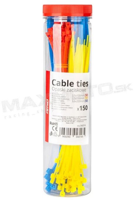 Sada viacfarebných plastovych sťahovacích pások AMiO pre najrôznejšie použitie. Balenie obsahuje 50 kusov 2,5 x 100 mm, 50kusov 2,5 x 150 mm, 50kusov 3,6 x 200 mm