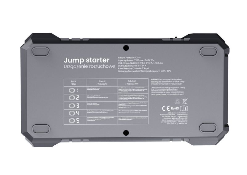 - multifunkčné zariadenie 4v1 (štartovací booster, vzduchový kompresor, powerbanka a LED baterka)
