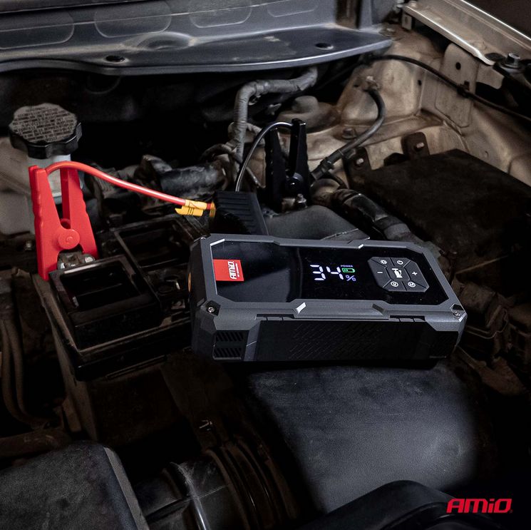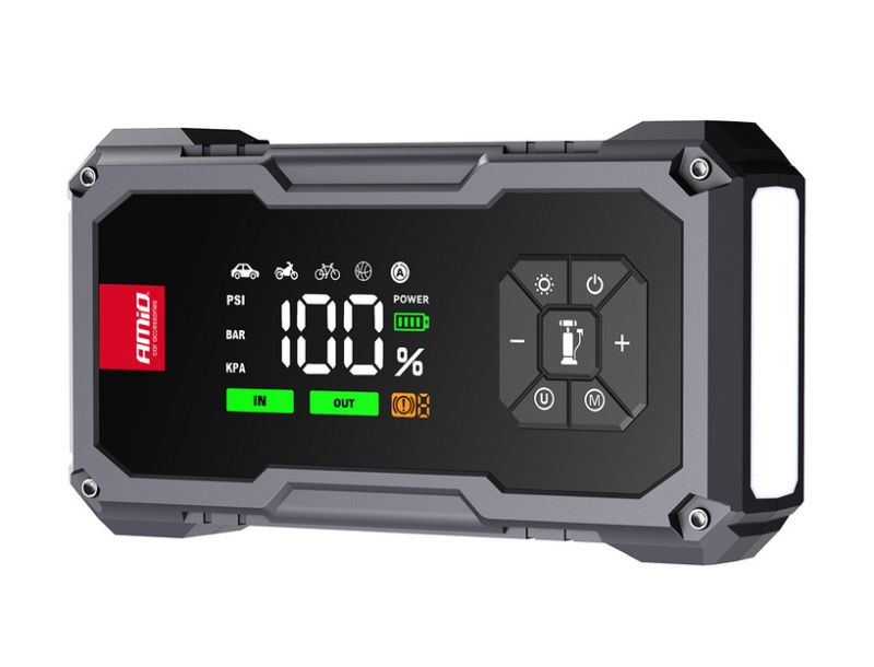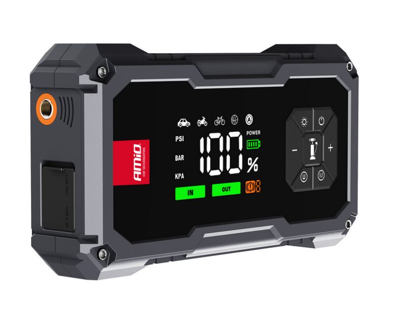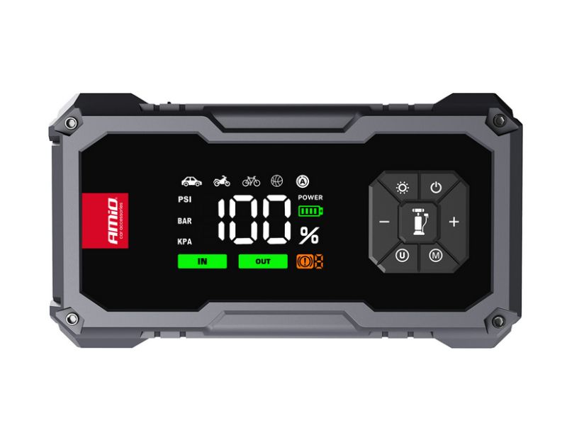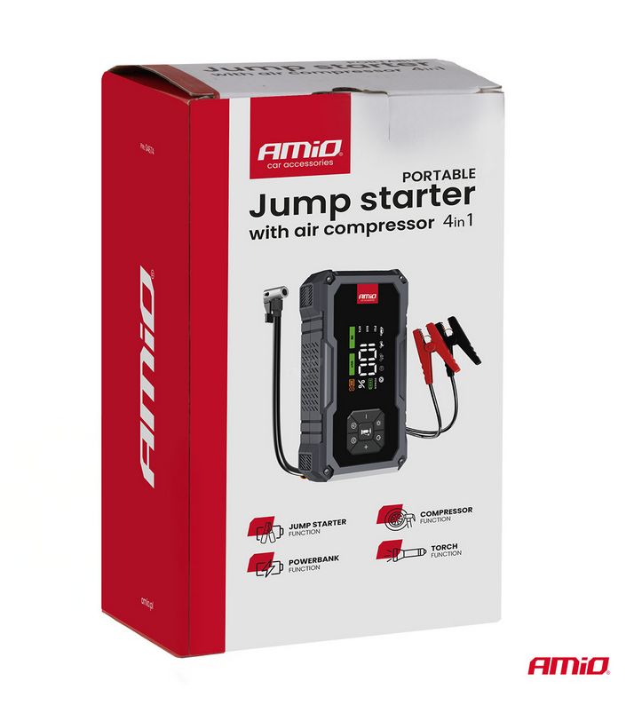 Štartovacie zariadenie AMIO 4in1 s kompresorom, powerbankou a LED baterkou, 12V, 04674