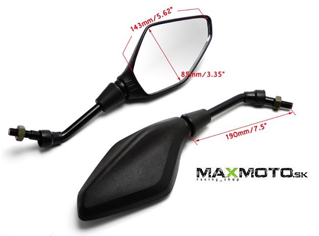 Sada spätných zrkadiel vhodných pre použitie na štvorkolke / motorke. Farebná úprava: čierna matná. Závit M10 - súčasťou balenia je sada redukcií závitu z M10 na M8 s pravým a ľavým závitom, úchyty na 22mm riadidlá. Rozmery tovaru uvedené vo fotogalérii produktu.