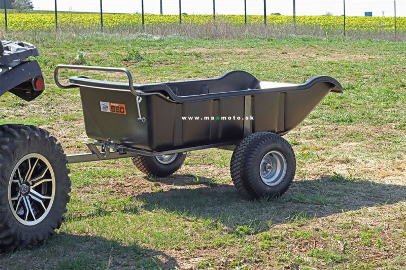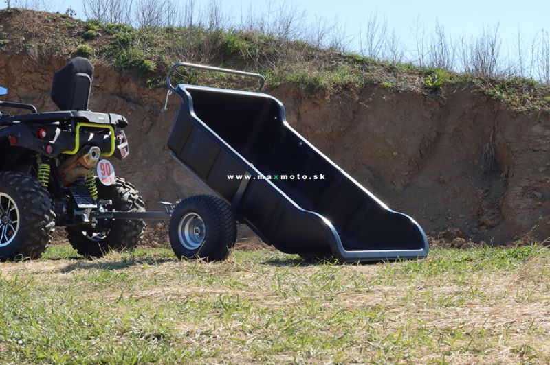 Praktický ľahký vyklápací vozík pre štvorkolky alebo záhradné traktory s veľkou plastovou korbou a nosnosťou do 680 kg.