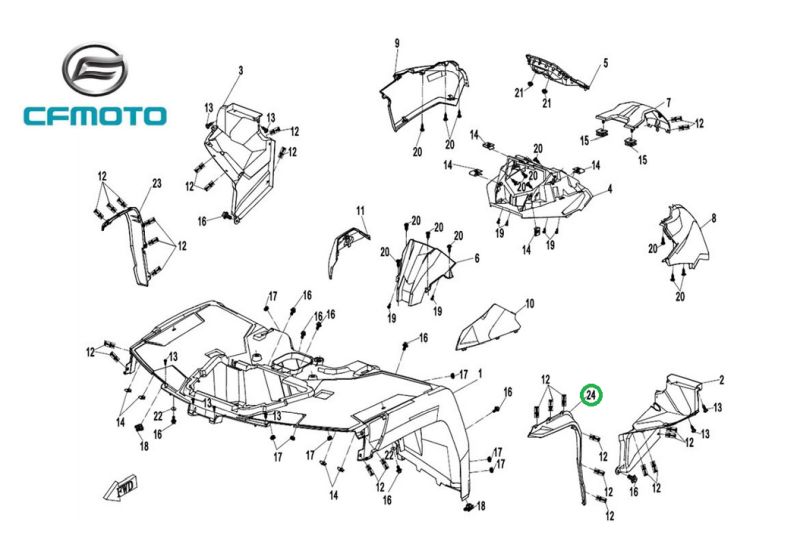 Rozširovací plast/ lem na predný ľavý blatník určený pre štvorkolky CF MOTO Gladiator X850 a X1000. Číslo originálneho dielu: 9AWA-260011