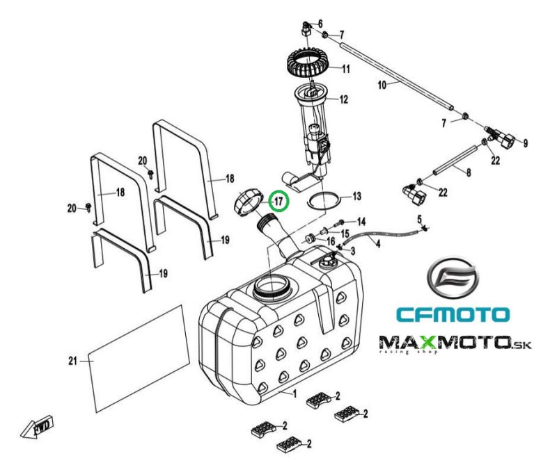 Víčko nádrže určené pre štvorkolky CF MOTO Gladiator X550, UTV 800 a Z1000. Číslo originálneho dielu: 7030-120060 (na schéme č. 17)