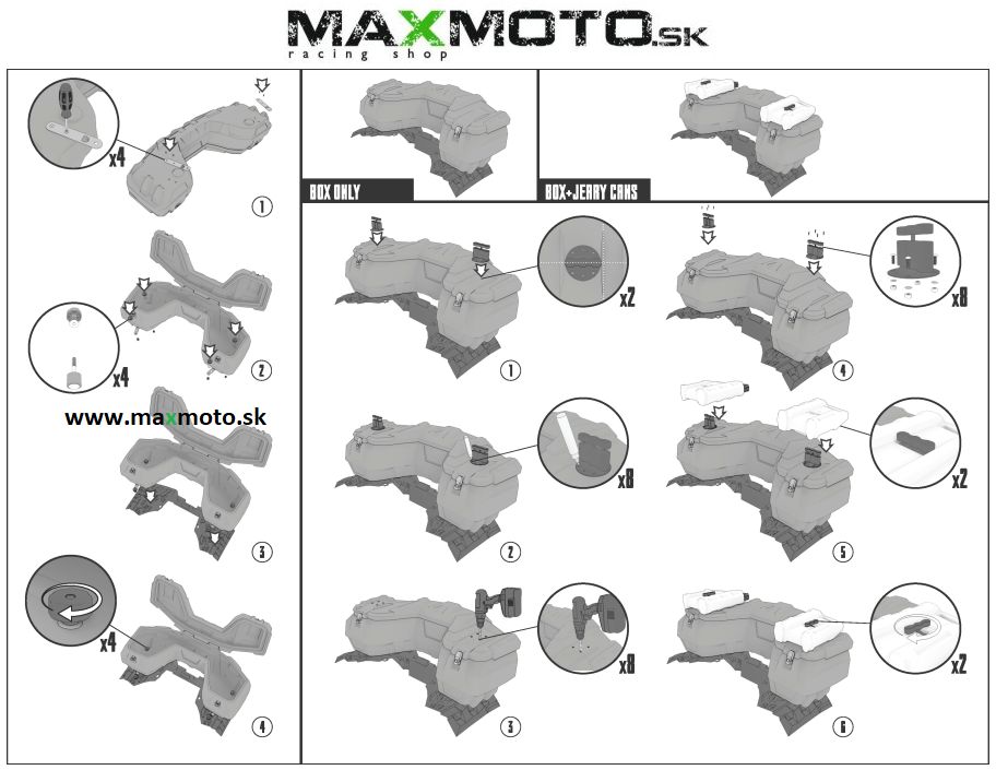 Tento box je možné namontovať len na štvorkolky POLARIS Sportsman Touring 850 a 1000. Pri vývoji tohto boxu boli vzaté do úvahy všetky vlastnosti konštrukcie tejto štvorkolky, aby box dokonale sedel a dizajnovo ladil. Inštalácia trvá menej ako 30 sekúnd, čomu napomáhajú konektory, ktoré sa priamo pripoja k existujúcim otvorom v boxe pričom nie je potreba odstrániť operadlo ani rúčku.