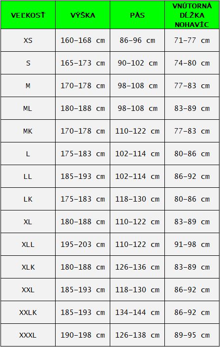 Veľkostná tabuľka nohavíc FINNTRAIL: