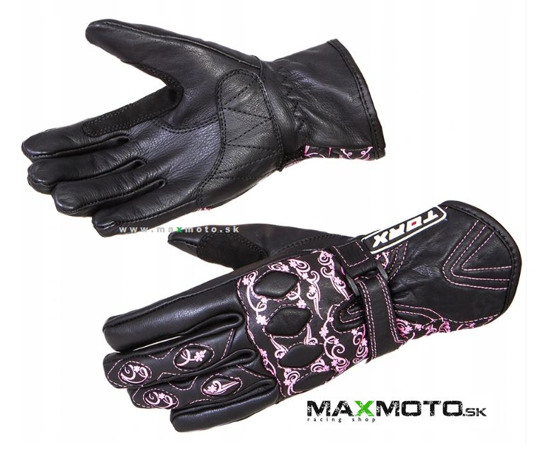 Dámske čierne kožené rukavice TORX Bella s ružovou potlačou.