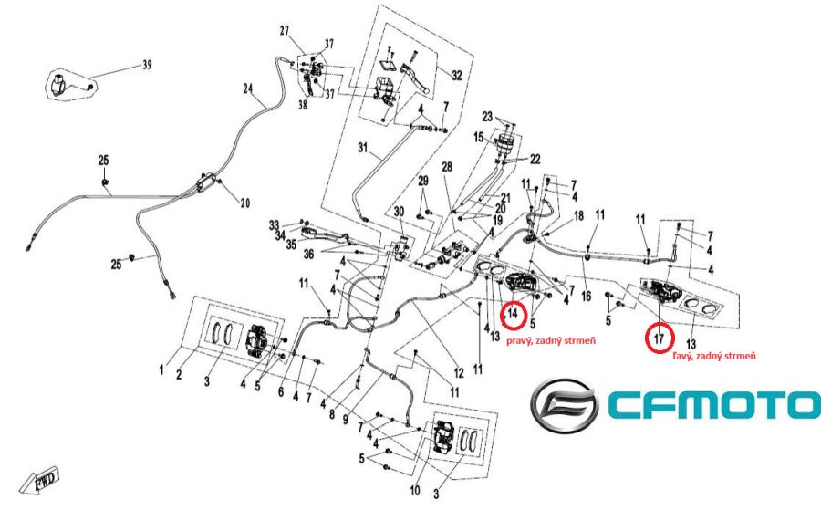 Brzdový strmeň zadný CF MOTO X450, X520, X550, X600, X650, X850, X8, 7020-081050-10000, 7020-081060-10000