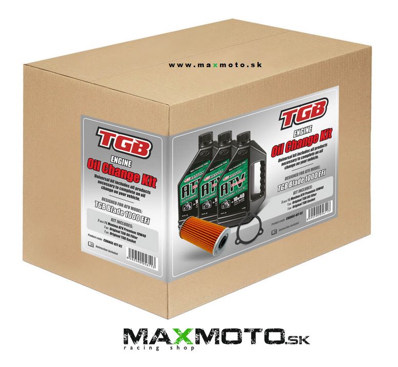 Sada na výmenu motorového oleja pre štvorkolky TGB Blade 1000 EFI obsahuje 3 x 1 liter oleja MAXIMA 10W40, tesnenie, filter TGB a návod s postupom.