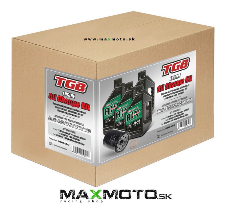 Sada na výmenu motorového oleja pre štvorkolky TGB Target + Blade 425, 525, 550, 600 obsahuje 4 x 1 liter oleja MAXIMA 10W40, filter TGB, tesnenie výpustnej skrutky a návod s postupom.